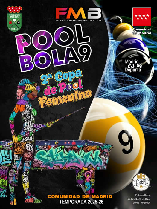 6 de Diciembre. 1ª prueba valedera para el ranking individual femenino de la CAM de la temporada 2025-26. Organizado por la Federación Madrileña de Billar. Lugar de la prueba: Paseo de Sta. María de la Cabeza, 75 Bajo (pendiente de confirmación). Cierre de inscripción: 4 de Diciembre. |