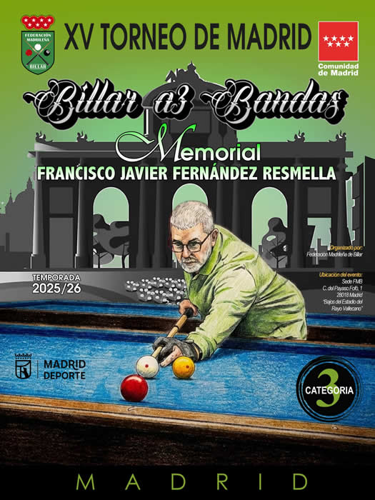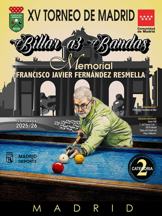 Del 3 al 12 de Octubre. Primera prueba del ranking de la CAM de billar a Tres Bandas de la temporada deportiva 2025-26. Organizado por el Club de Billar Kalima-Rivas, Polideportivo Parque del Sureste, Rivas Vaciamadrid. Cierre de inscripción: 26 de Septiembre - Ranking y desarrollo - Resultados on-line - Retransmisiones. |