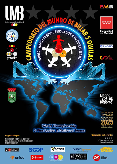 Días 26 y 27 de Abril. 2ª prueba valedera para el ranking individual femenino de la CAM de la temporada 2024-25. Organizado por la Federación Madrileña de Billar. Lugar de la prueba: Club Billar Tilt, Paseo de Sta. María de la Cabeza, 75 Bajo. Cierre de inscripción: 24 de Abril. |