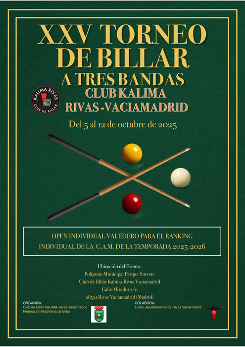 Del 3 al 12 de Octubre. Primera prueba del ranking de la CAM de billar a Tres Bandas de la temporada deportiva 2025-26. Organizado por el Club de Billar Kalima-Rivas, Polideportivo Parque del Sureste, Rivas Vaciamadrid. Cierre de inscripción: 26 de Septiembre - Ranking y desarrollo - Resultados on-line - Retransmisiones. |