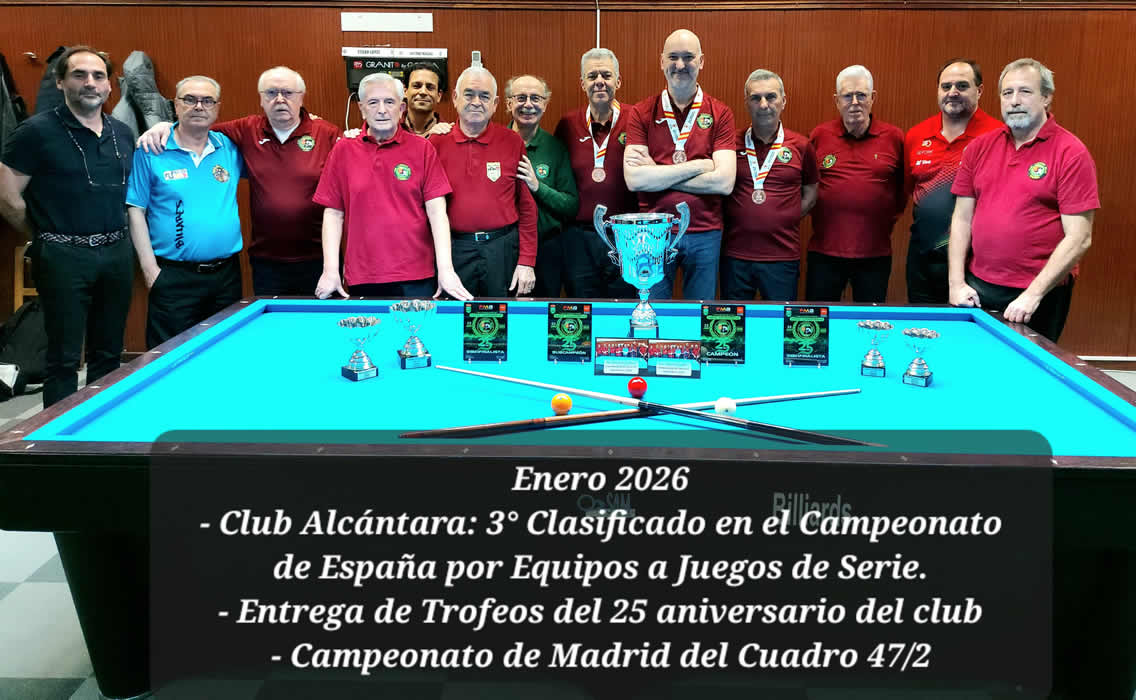 10 y 11 de Enero. Tercera prueba valedera para el ranking individual de la CAM de la temporada 2025-26. Organizado por el Tilt Billar Club, Paseo de Sta. María de la Cabeza, 75 Bajo. Cierre de inscripción: 5 de Enero. |